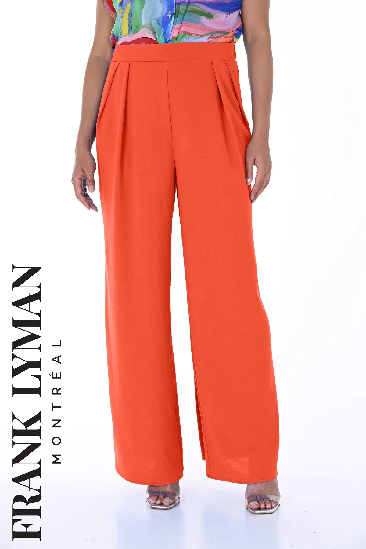 Frank Lyman 246415 Orange Front Pleat Trousers. A fabulous light weight trouser with front pleats, featuring wide waistband and a back zip. A wide leg trouser with many choices of Frank Lyman tops to team up for a stunning outfit, as pictured in our gallery.