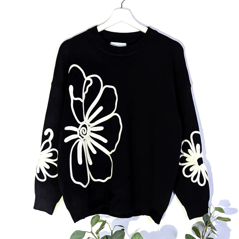 Sarah Tempest Black Sweater with White Flowers On each arm and body. A striking loose fitting knit to team up with a black pair of jeans and boots for the Winter season ahead